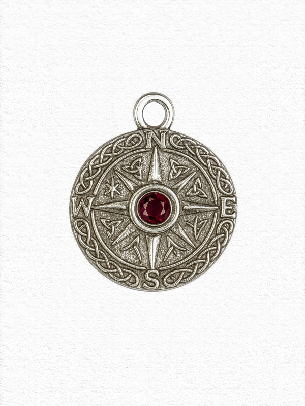 Crafted in pure .999 fine silver, this pendant embodies the spirit of navigation and ancient mysticism. Its compass rose design features engraved cardinal and intercardinal directions, guiding the wearer with symbolic precision. At the center burns a genuine ruby—a vivid red beacon that evokes passion, protection, and the fire of purposeful movement. Encircling the design, a Celtic knot border weaves continuity and fate into the piece, making it not just jewelry, but a talisman for those who chart their own course. Ideal for adventurers, storytellers, and seekers of the extraordinary.