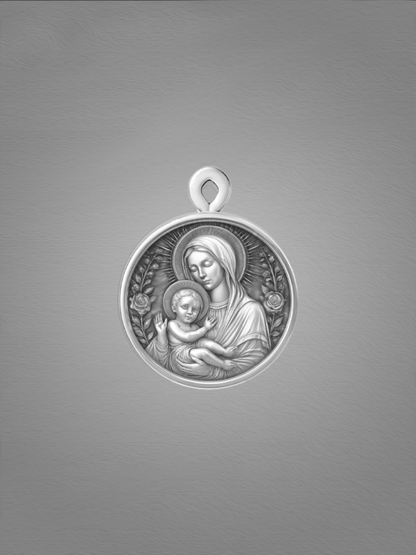 Honor faith and motherhood with this exquisite .999 silver pendant showcasing the Virgin Mary cradling the infant Jesus. The serene design features finely detailed halos, graceful floral accents, and a softly textured border that frames this sacred scene with timeless beauty.